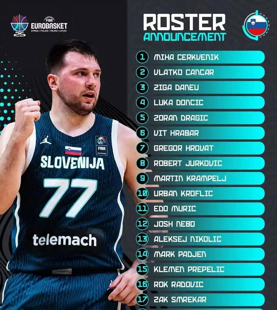 斯洛文尼亚的球员不算众多,但围绕东契奇打造的“一星四射”阵容颇具潜力。在东契奇成年后,球队倾向于围绕他建队,同时保留一些老将。阵容中包含东契奇、左兰德拉季奇和钱查尔等,NBA球员德拉季奇的弟弟左兰德拉季奇也在列。东契奇今夏减重显著,其在NBA新赛季中值得期待,欧洲杯则是寻找状态的良机。