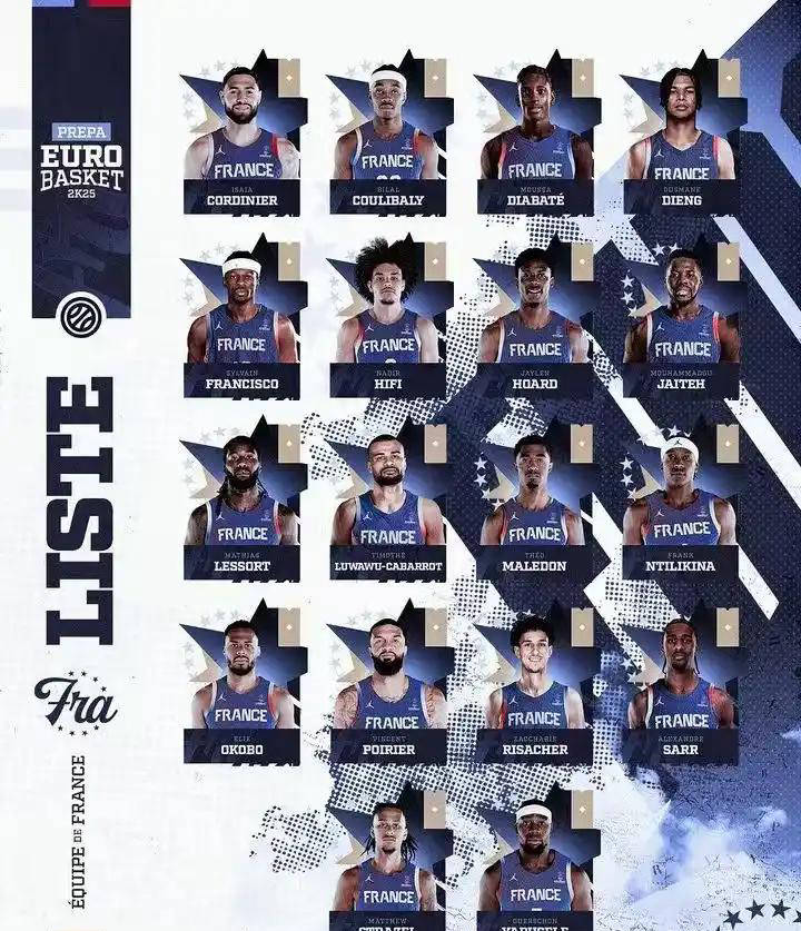 作为东京奥运会的银牌得主,法国男篮现有众多NBA球员,内线实力堪榷。然而,本届赛事文班亚马和戈贝尔等明星球员缺席,极大地降低了他们争冠的希望,连富尼耶也宣布不打。此次出征的阵容年轻化,包含五名NBA球员,而24届的状元及榜眼也全数到场。队伍名单包括科尔迪尼耶、库利巴利、迪亚巴特等16位球员。