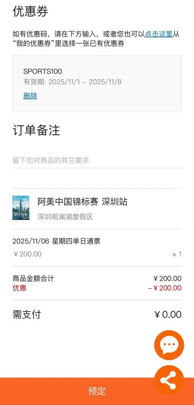 5. 在下一页面“优惠券”位置,填写体育大生意专属优惠码“SPORTS100”,系统将提供200元优惠折扣优惠,从而实现免费购票。