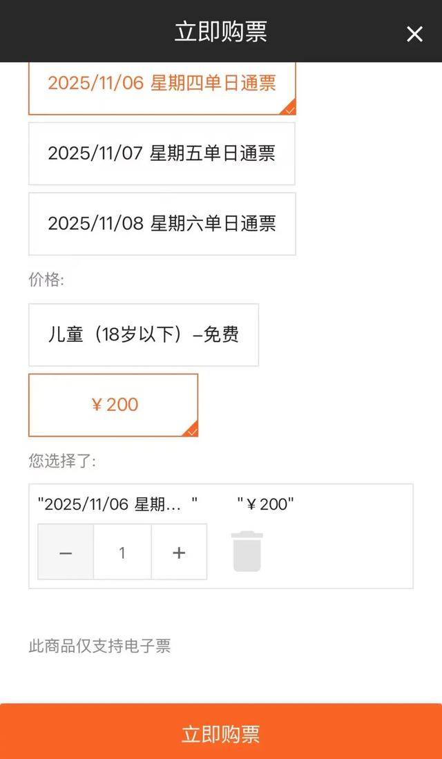 4. 选择“星期四单日通票”“星期五单日通票”,系统将显示票价200元。”进入到下一页面。