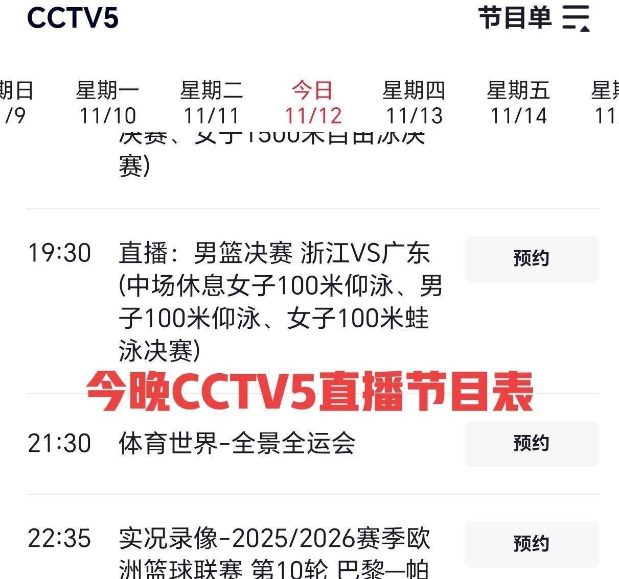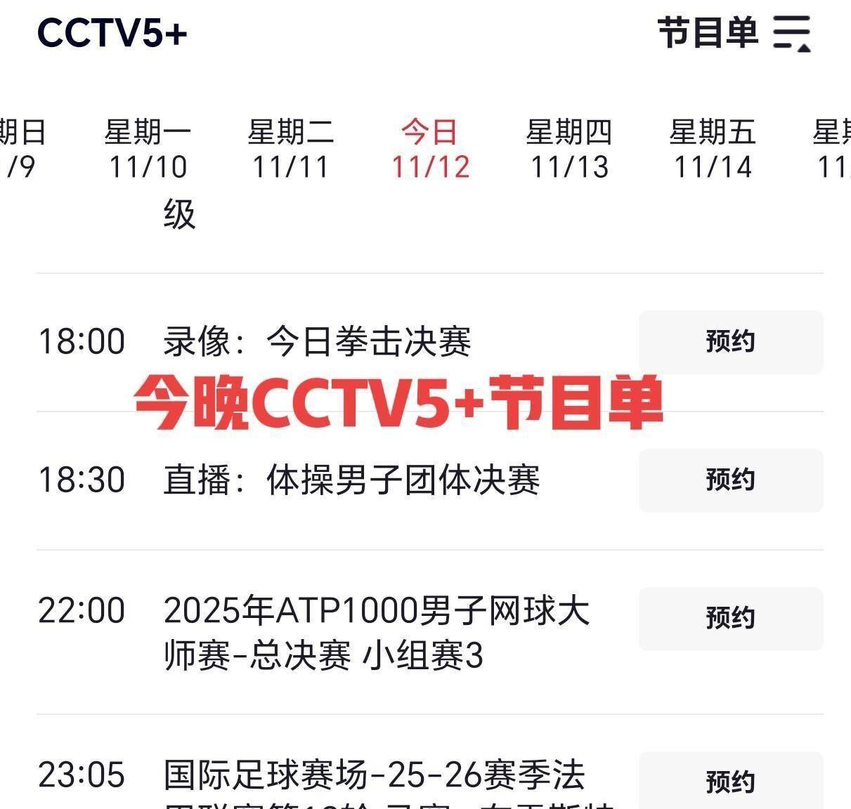 晚间档的节目还包括21:30的《体育世界》全景全运会,以及22:35播出的欧洲篮球联赛录像。 对于网球迷,CCTV5+在22:00安排了2025年ATP男子网球大师赛总决赛小组赛的直播。